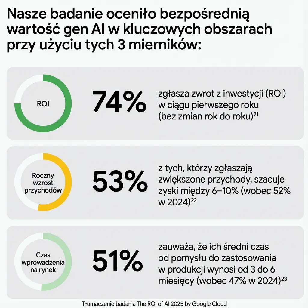 Raport Google Cloud „ROI of AI 2025” przebadał prawie 3500 firm z różnych branż. Trzy czwarte z nich odnotowało pozytywny zwrot z inwestycji. Średni ROI wyniósł 3,7-krotność zainwestowanych środków.