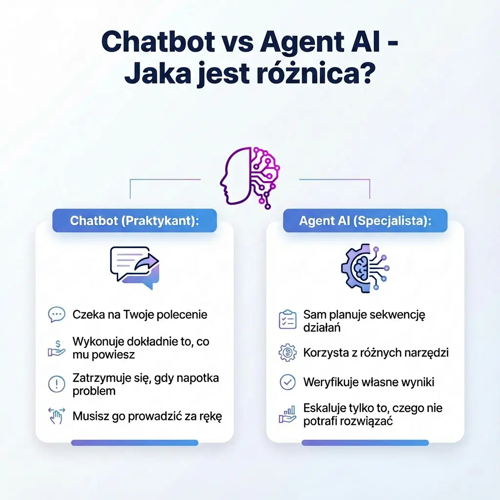 Chatbot czeka na Twoje polecenie i wykonuje dokładnie to, co mu powiesz. Agent AI sam planuje sekwencję działań, korzysta z różnych narzędzi, weryfikuje własne wyniki i eskaluje tylko to, czego nie potrafi rozwiązać. To jak różnica między praktykantem a doświadczonym menedżerem.